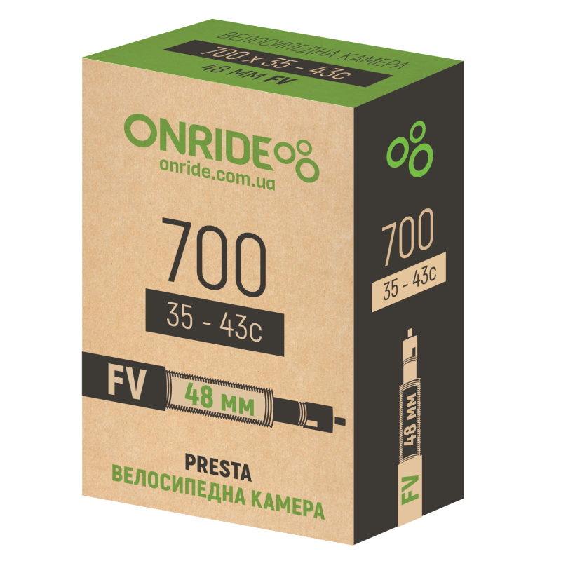 Камери ONRIDE з ніпелем Presta (FV) виготовляються за допомогою процесу формування, який забезпечує постійну товщину гуми. Як наслідок, вони легкі та не виявляють значного опору коченню. Витривалі до стиснення. Важливо підтримувати в камері тиск (діапазон номінальних значень вказаний на вашій покришці). Неналежний тиск може бути причиною передчасної деформації камери (проколи зміїний укус руйнація матеріалу через утворення складок). Товщина стінки 0,9 мм Розмір: 700x35/43С Пакування: картонна коробка
