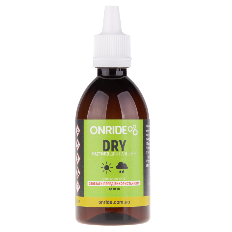 ONRIDE DRY - двокомпонентне мастило що відмінно розподіляється між рухомими елементами ланцюга. Запобігає налипанню пилу та бруду, захищає від корозії.