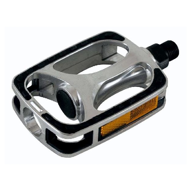 Алюминиевые педали с противоскользящей накладкой на рамке и насыпными подшипниками. Светооражатели для безопасности на дороге. Серебрист цвет. Подходят для города. Вес 401 g.