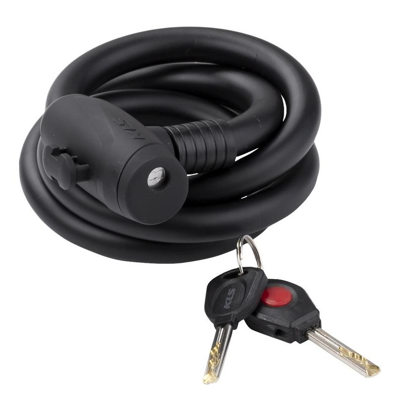 Спіральний велосипедний замок. В комплекті до замка надається 2 ключі (один звичайний, другий зі світлодіодним підсвічуванням) та кріплення, за допомогою якого замок можна закріпити на підсідельний штир. Циліндровий механізм замка KLS Hardcoil оснащений заглушкою, яка мінімізує потрапляння вологи та піску в середину.